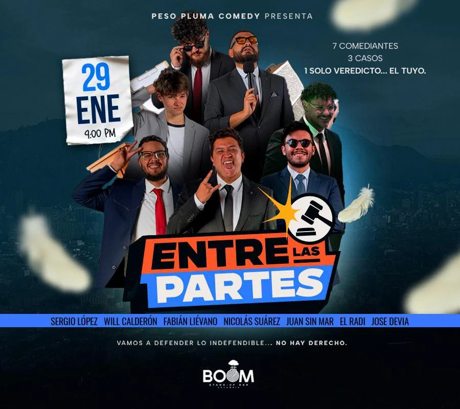 Entre las partes es un formato de stand up comedy que propone un ejercicio colectivo: siete comediantes se enfrentan a tres casos para desarrollar material desde perspectivas distintas. El resultado es una noche de comedia en constante cambio, donde conviven estilos, tonos y miradas sobre situaciones comunes y contradicciones cotidianas.